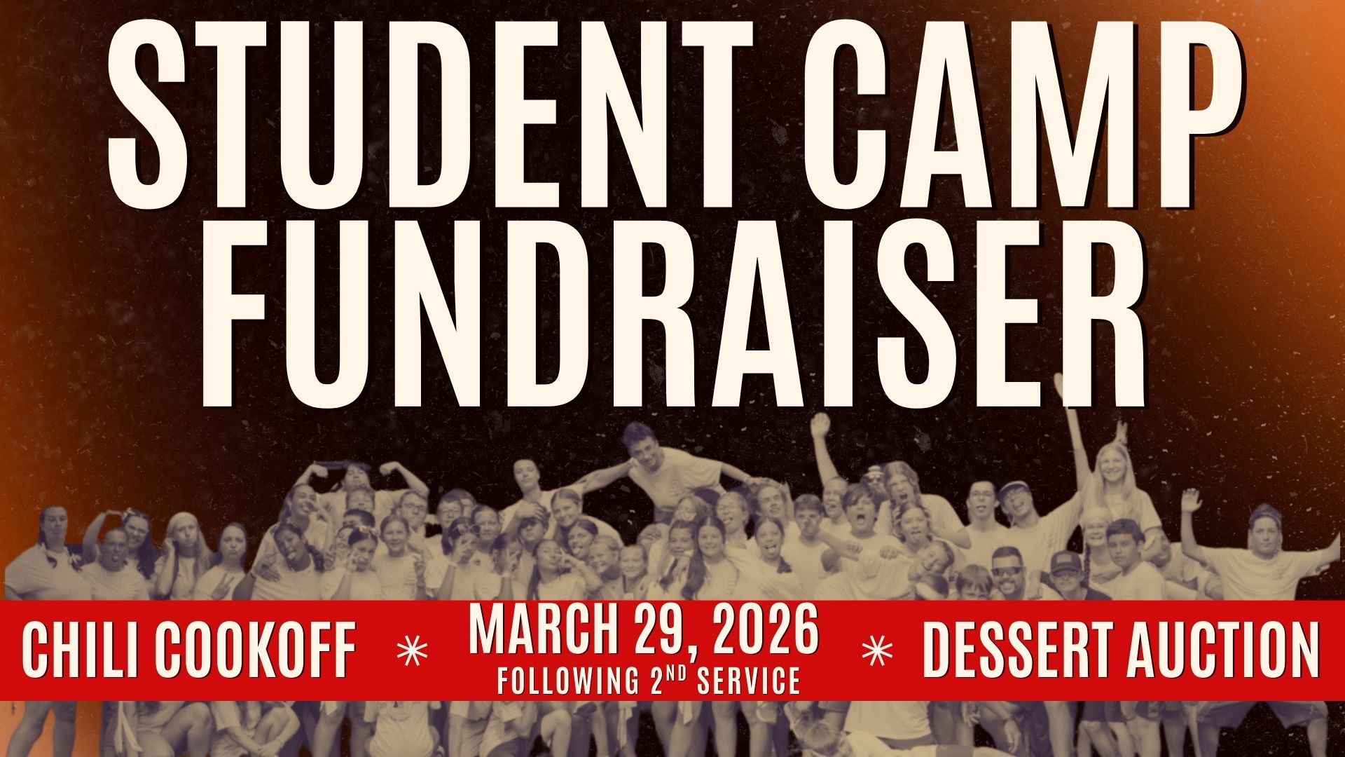 Join us for an exciting Student Camp Fundraiser on March 29, 2026, immediately following 2nd service! This is a fun-filled afternoon designed to bring our church family together while supporting our students as they prepare for camp. Come hungry and ready to participate in our Chili Cook-Off, where you’ll get to taste a variety of delicious homemade recipes and vote for your favorite! Then, stick around for our Dessert Auction, where you can bid on incredible homemade treats—all for a great cause. Every dollar raised goes directly toward helping our students encounter God in a powerful way at camp this year. Your support makes a lasting impact in their lives! Bring your family, invite a friend, and come ready to eat, laugh, and give generously. We can’t wait to see you there!